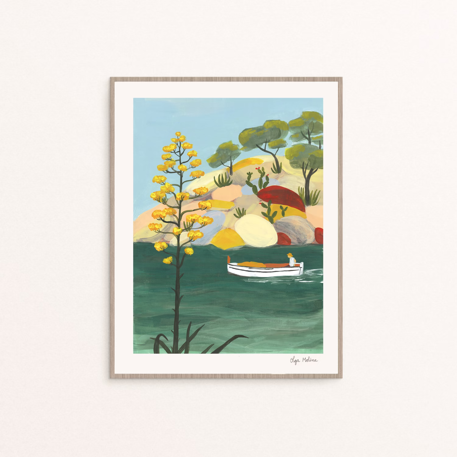 Cove with boatman print hand signed by Olga Molina. The magic landscapes of Costa Brava.